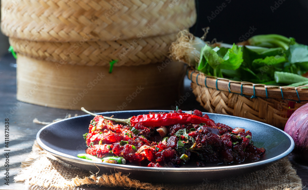 Raw Beef Larb With Liver And Blood In A Plate Ready To Serve Stock Photo Adobe Stock